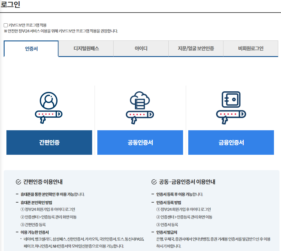 3. 회원 신청하기를 누르고 간편인증, 공동인증서, 금융인증서 중 편한 방법으로 로그인해준다.