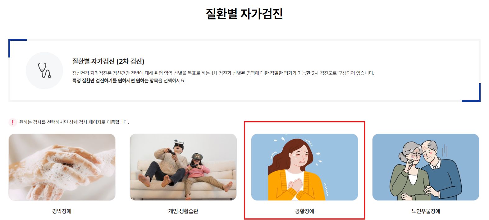 2. 질환별 자가검진에서 공황장애를 클릭한다.