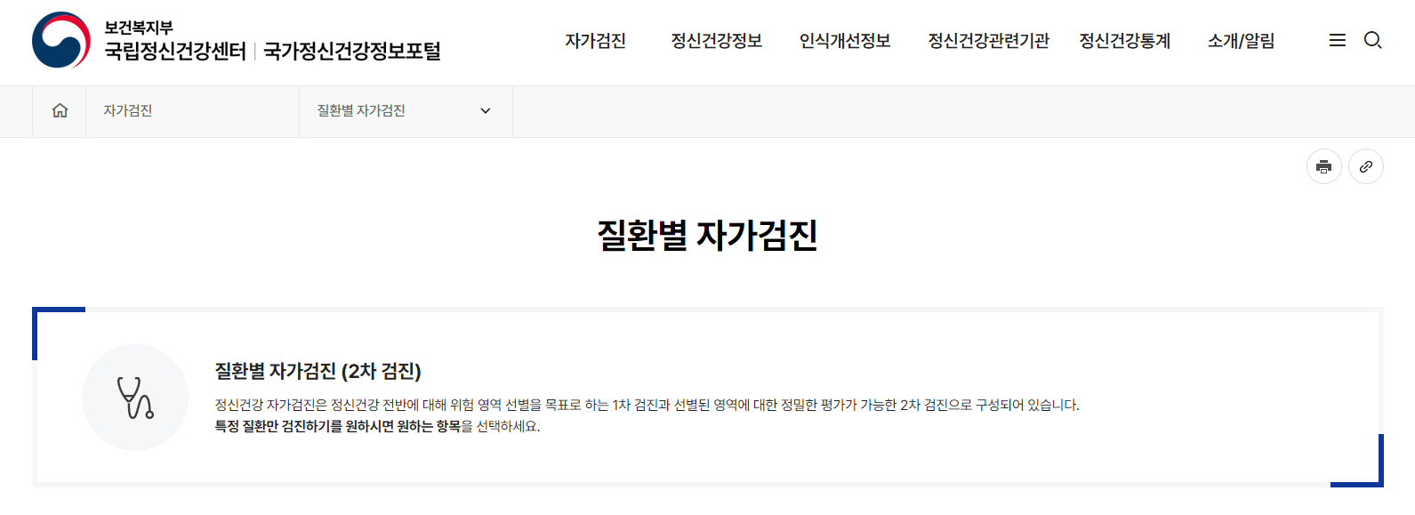 1. 아래 버튼을 클릭하면 국립정신건강센터 홈페이지로 이동, 공황장애 자가진단 테스트가 가능하다.