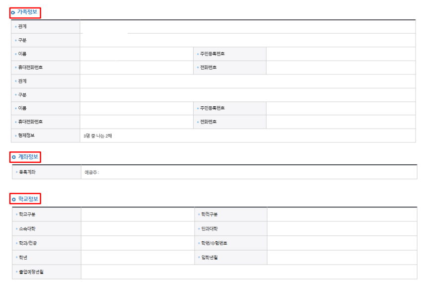 형제/자매 수 및 서열에 따라 국가장학금 지원 가능금액에 변동이 있을 수 있으므로 반드시 정확한 정보를 입력하도록 한다.