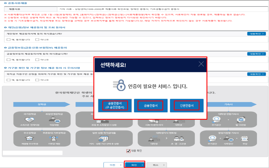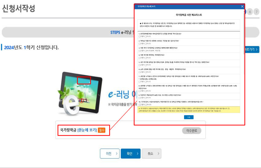 국가장학금 사전 체크리스트, 신청 및 서류제출방법 등 확인 후 팝업 하단 다음 버튼을 클릭한다.