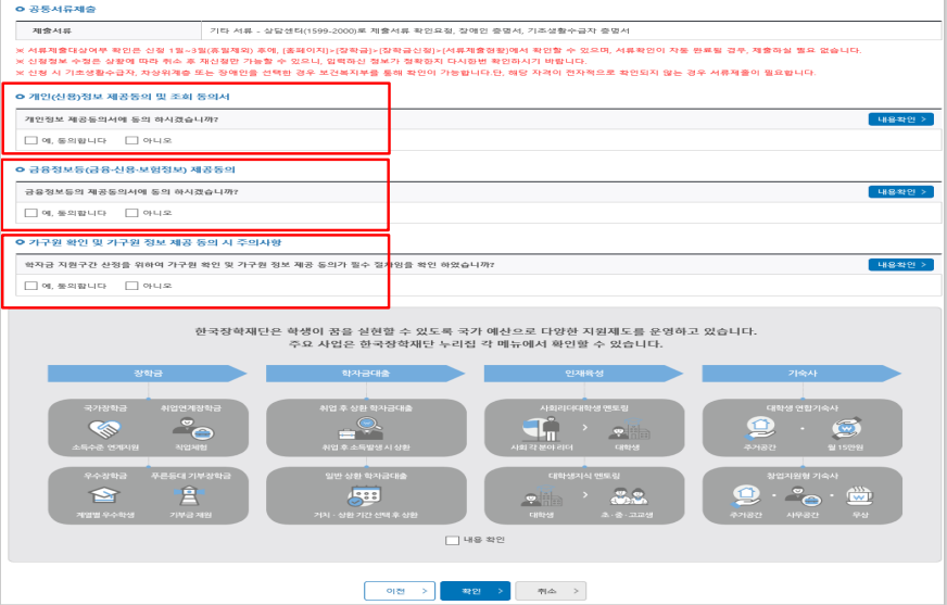 개인정보 제공동의, 금융정보 등 제공동의, 가구원 정보 제공동의 필요성, 진행방법 등 주의사항을 확인한다.