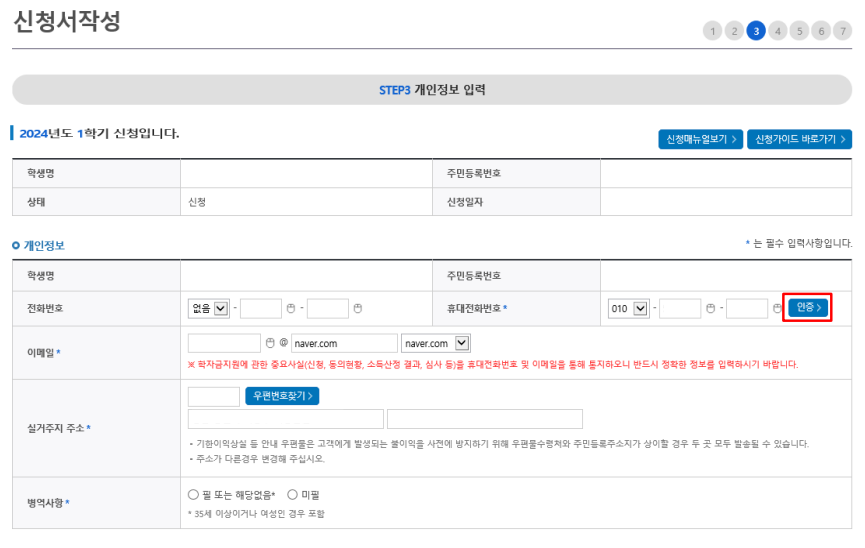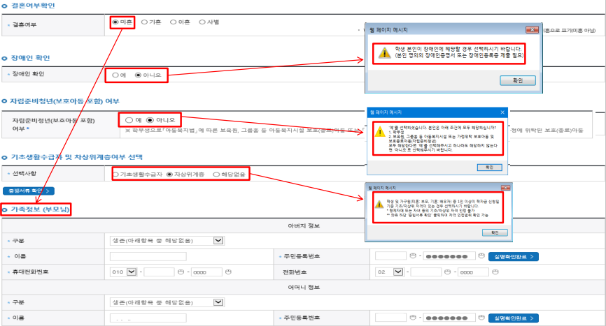 부모님의 주민등록번호 입력 시 실명인증이 필요하다. 성명, 주민번호, 연락처 입력 시 정확한 정보를 입력하여 심사지연 등 불이익을 방지하도록 하자.