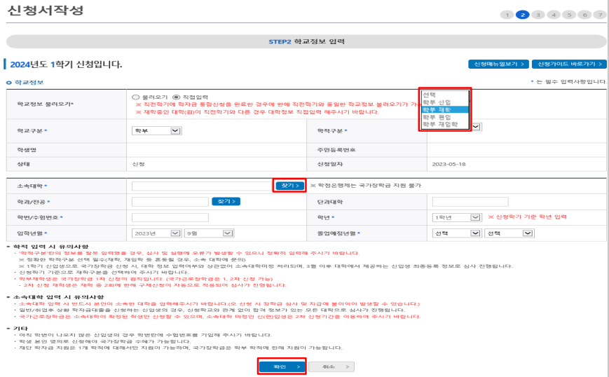 ※ 소속대학 오신청, 학적 오신청 발생 시 심사에 오류가 발생할 수 있으므로 정확하게 입력한다.