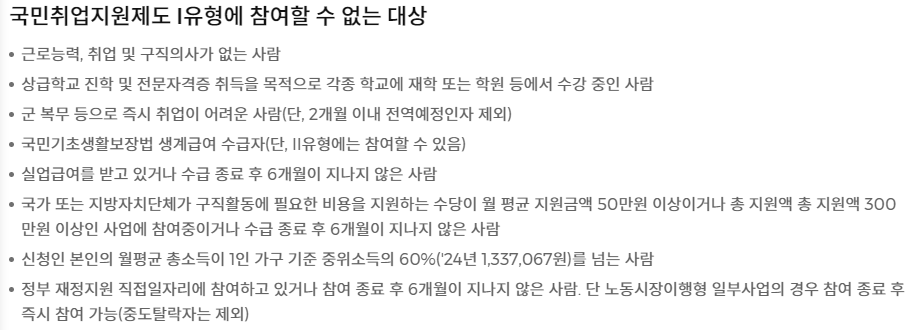 *요건심사형 : 15 ~ 69세 구직자 중 가구단위 중위소득 60%이하, 재산 4억원(15 ~ 34세 청년은 5억) 이하, 최근 2년 안에 100일 또는 800시간 이상의 취업경험이 있는 사람 *선발형 : 요건심사형 중 취업경험요건을 충족하지 못한 사람(단, 15 ~ 34세 청년은 가구단위 중위소득 120%이하, 재산 5억 이하, 취업경험 무관) |