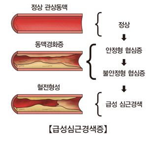 심근경색은 심장 근육이 혈액 공급을 받지 못해 괴사하는 질환이다. 심장 근육에 혈액을 공급해주는 관상동맥은 혈관의 크기에 비해 많은 혈액을 보내야 한다. 혈관벽에 콜레스테롤 등이 달라붙거나 혈관이 갑자기 좁아지는 이상운동을 보인다거나 혈전이 혈관을 막는 등 여러 원인들이 동시다발적으로 발생하게 되면 그 피를 받는 부위의 심근이 제 기능을 하지 못해 다른 정상 심근과 조화로운 운동을 하지 못한다. 이 과정에서 극심한 통증이 생겨나며, 자연스럽게 혈액공급이 재개될 경우 통증은 사라지게 된다.