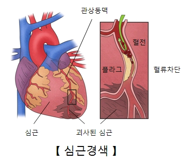하지만 자연스럽게 혈액공급이 재개되지 않고 막힌 상태가 유지되면, 심장근육은 괴사하기 시작한다. 이를 심근경색이라고 하며 이로 인해 환자는 극심한 통증을 호소하고 의식을 잃게 되며, 심장 기능이 떨어져 결국 심실세동, 심장마비를 거쳐 사망에 이르게 된다.