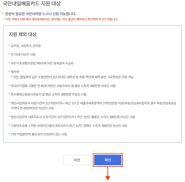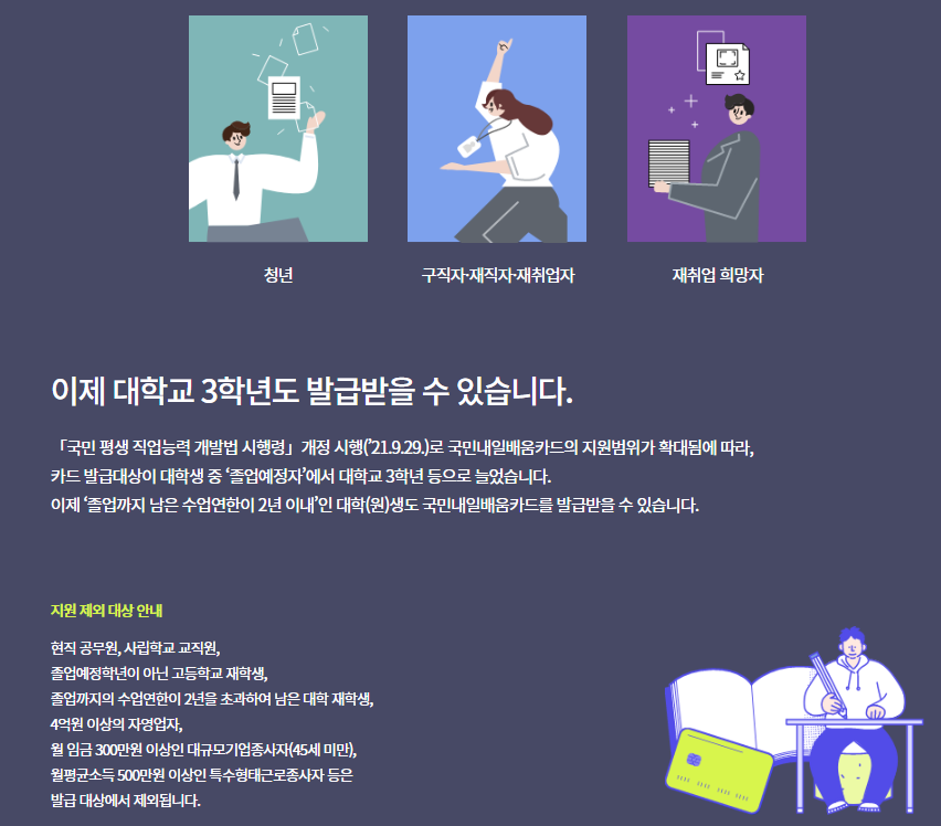 ※ 단, 졸업예정학년이 아닌 고등학교 재학생, 졸업까지의 수업연한이 2년을 초과하여 남은 대학 재학생, 현직 공무원, 사립학교 교직원, 4억원 이상의 자영업자, 45세 미만의 월 임금 300만원 이상인 대규모기업종사자, 월 평균소득 500만원 이상인 특수형태근로종사자 등은 대상에서 제외된다.