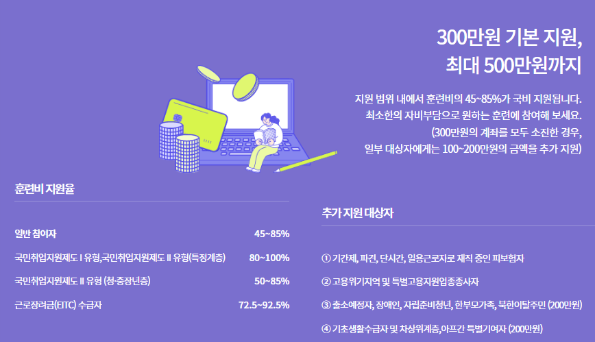 - 지원 범위 내에서 훈련비의 45 ~ 85%가 국비 지원된다.