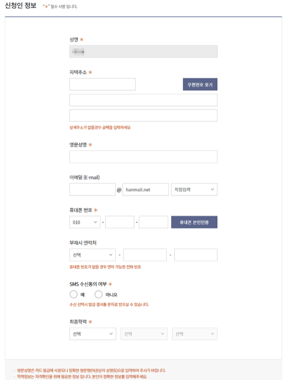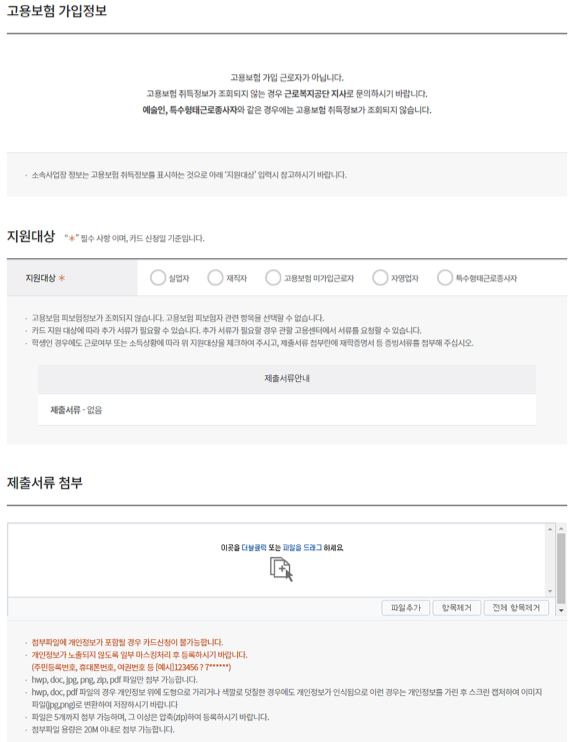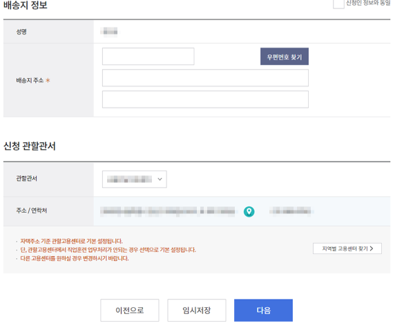 6. 신청인 정보, 실물 카드정보, 고용보험 가입정보, 지원대상, 제출서류 첨부, 배송지 정보, 신청 관할관서 등 필요한 정보를 입력하고 다음을 누르면 신청이 완료된다.