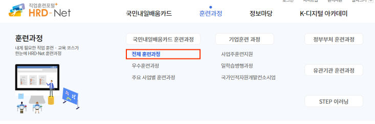 1. 직업훈련포털 사이트에서 훈련과정 → 전체 훈련과정 버튼을 클릭한다.