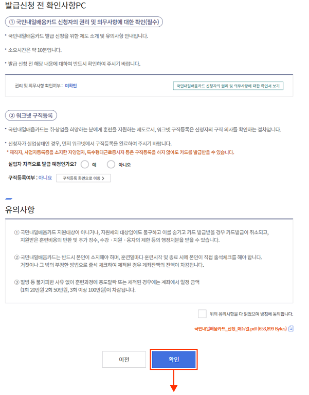 5. 발급신청 전, 확인사항 및 유의사항을 체크하고 확인버튼을 누른다.