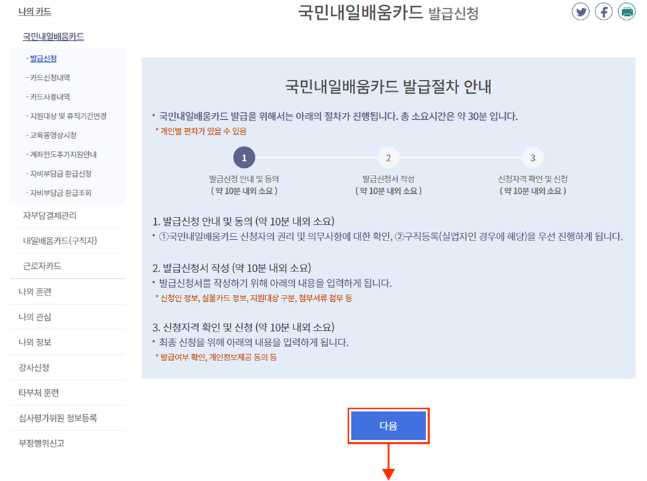 3. 나의카드 → 국민내일배움카드 → 발급신청을 누른 후, 발급절차 안내를 읽어보고 다음을 클릭한다.
