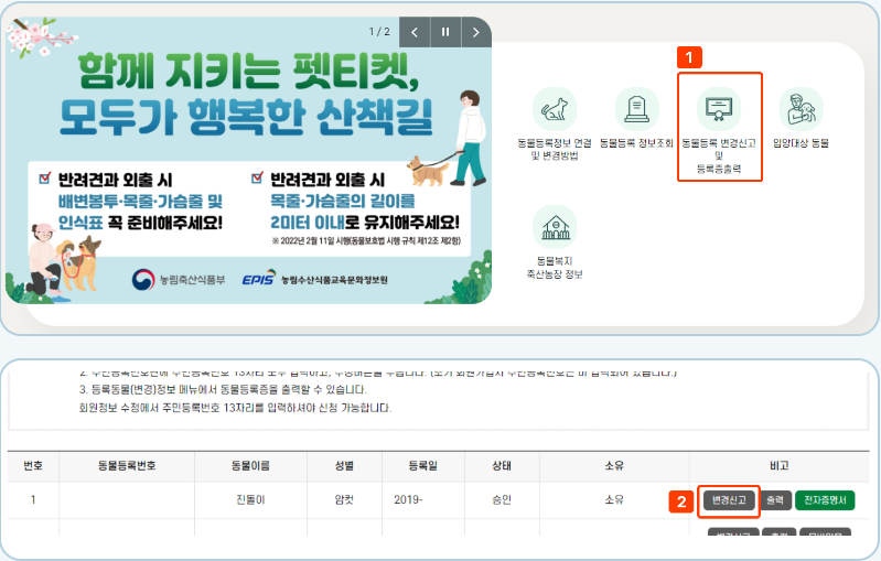 동물 등록정보 연결 및 변경방법은 다음과 같다.