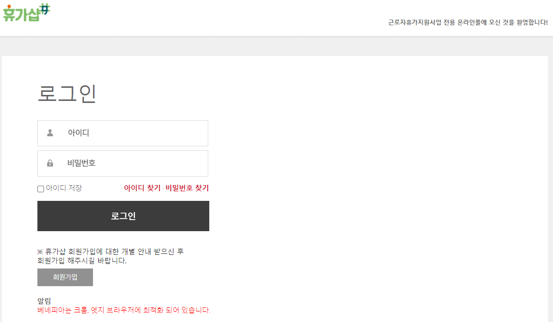 근로자 휴가지원사업 전용 온라인 쇼핑몰이다. 참여한 근로자들만 이용이 가능한 폐쇄몰로 운영이 되고 있다.