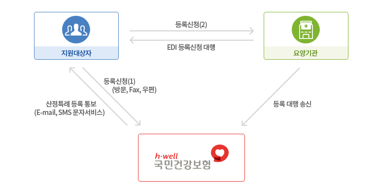 암, 희귀질환, 중증난치질환, 중증치매, 중증화상, 결핵, 잠복결핵감염자 환자의 경우 의사가 건강보험 산정특례 등록 신청서를 작성하여 국민건강보험공단 지사 또는 요양기관에 등록 신청한다.