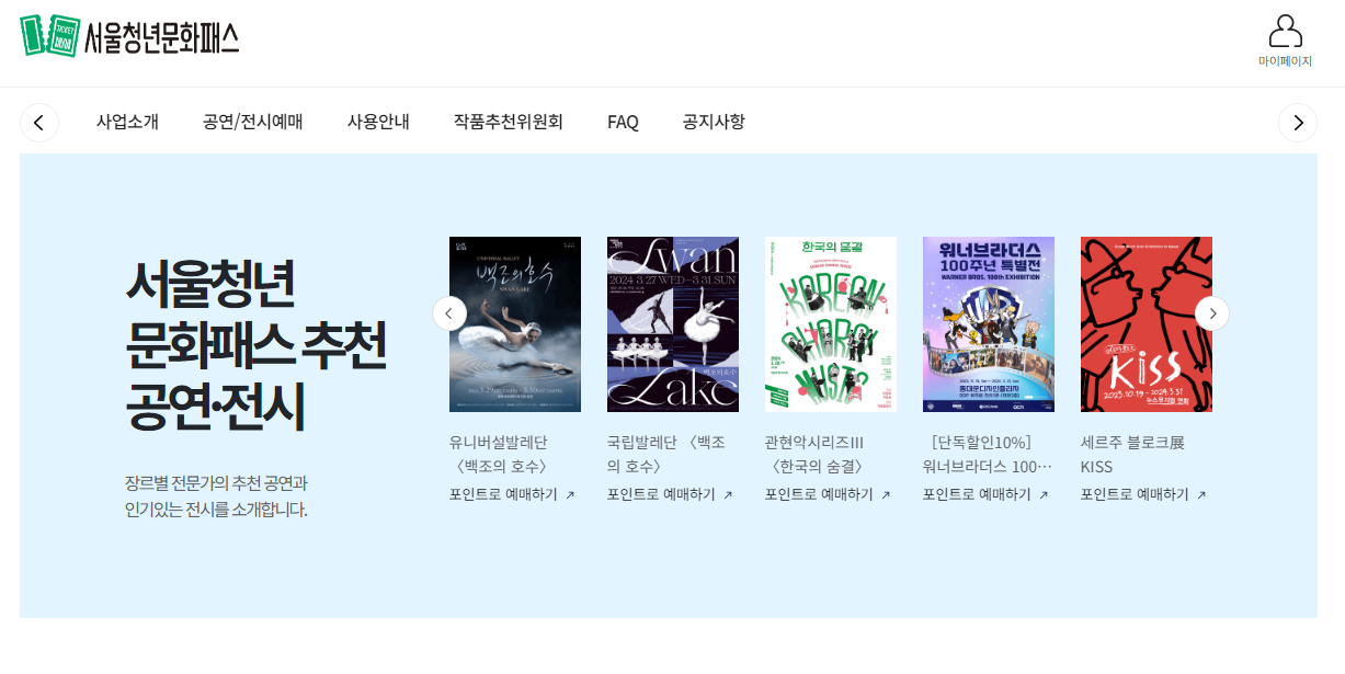 - 서울청년문화패스 회원 미가입 및 카드 미발급 시 공연과 전시 예매가 불가능하다.