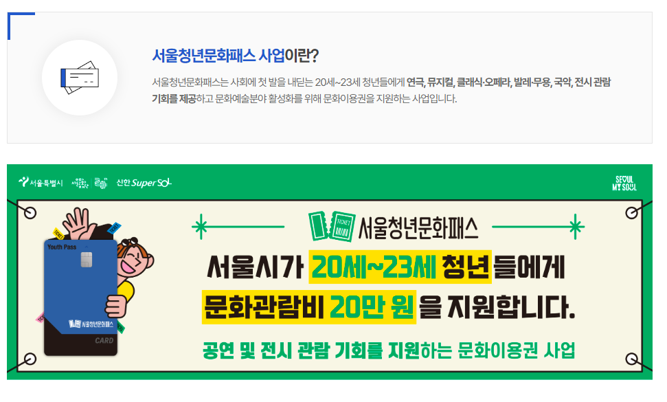 서울시에서 2001년생 ~ 2004년생 청년들에게 문화관람비 20만원을 지원해주는 사업을 시행하고 있다.
