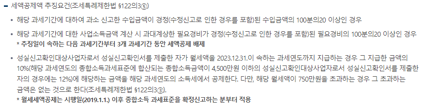 - 성실신고확인서 제출자가 성실신고 확인에 직접 사용한 비용의 100분의 60을 사업소득에 대한 소득세에서 공제해준다.(단, 한도는 2017년 과세연도까지는 100만원, 2018년 과세연도부터는 120만원)