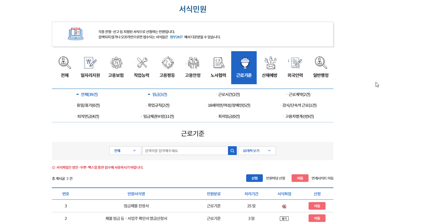 3. 근로기준을 클릭, 임금을 클릭한다. 임금을 클릭하면 아래 화면에 임금체불진정서 게시글이 나온다. 옆에 임금체불신청서로 이동하기 버튼을 클릭한다.