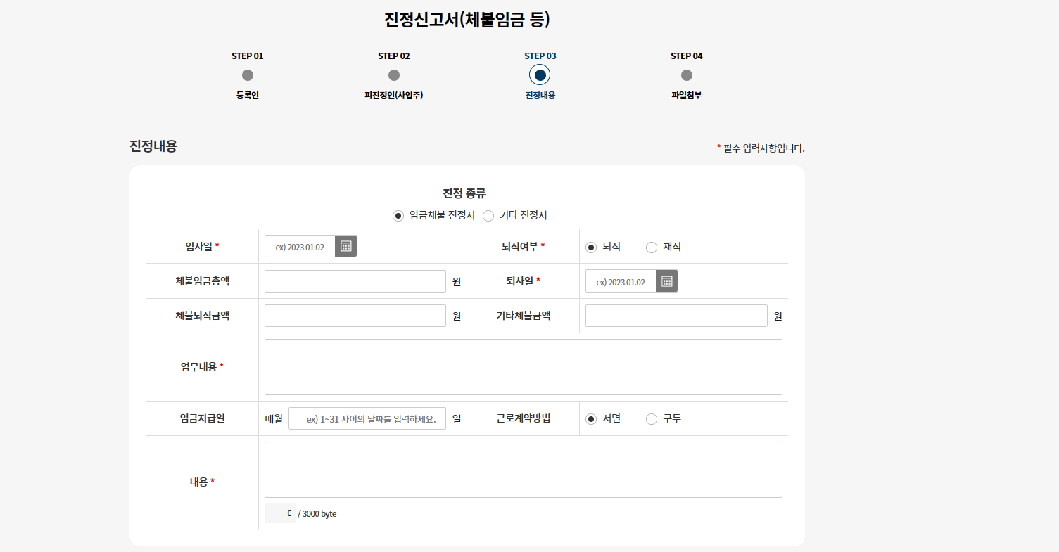 6. 진정종류를 선택하고 야간, 연장수당 임금체불에 대한 내용을 상세히 적어서 제출하면 된다.