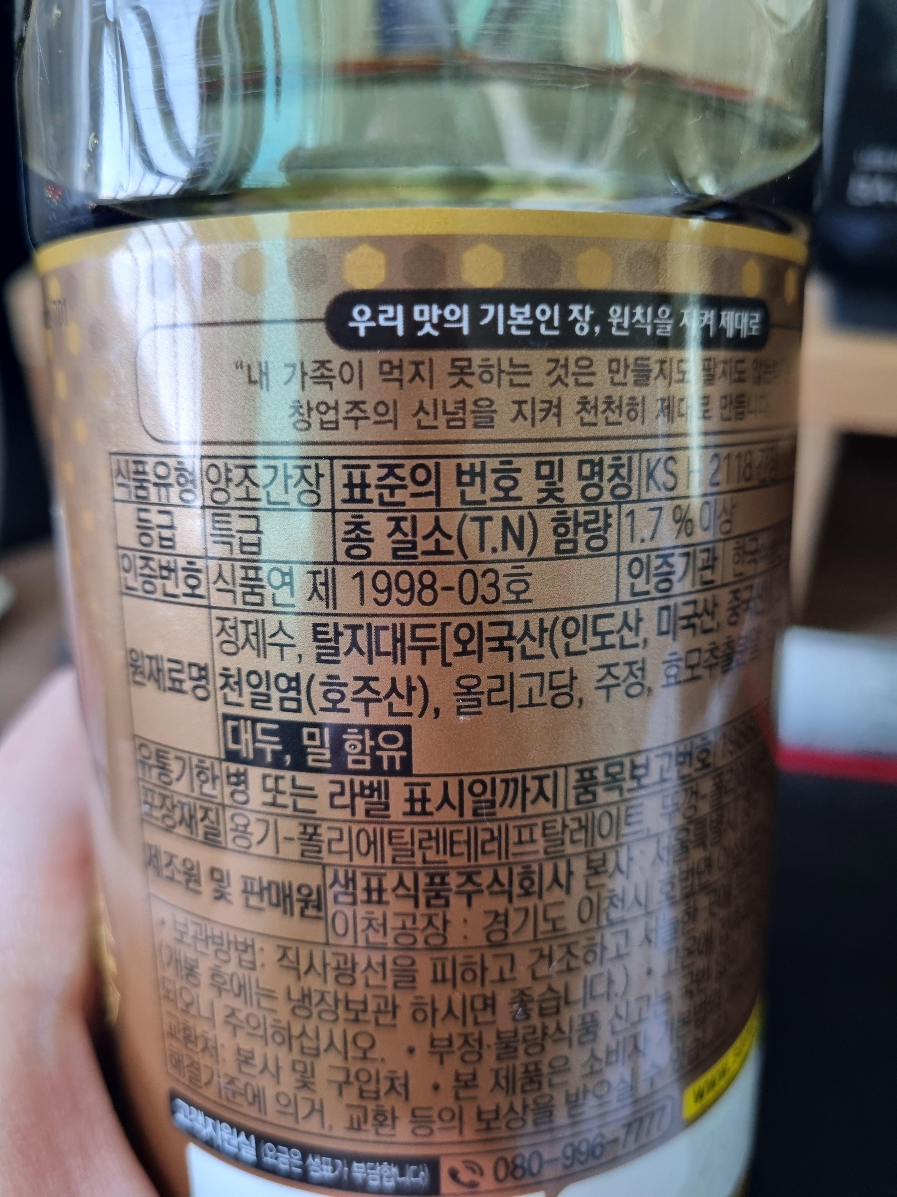 TN지수가 1.7%이상인 특급의 간장임을 알 수 있다. 원재료도 살펴보면 천연재료 이 외 다른 첨가제가 없는 간장이다. 이렇게 간장 뒷면을 자세히 살펴보면 어떤 간장을 먹고 있는지에 대해서 자세히 알 수 있다.