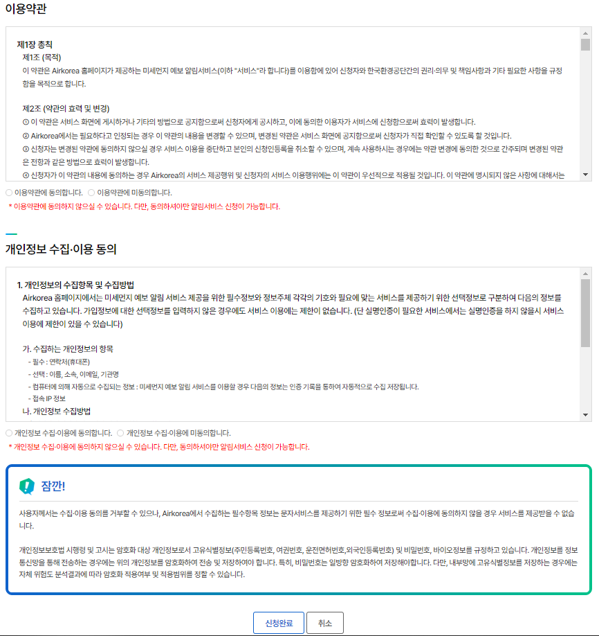 2. 문자서비스 신청 화면이 나타나고 본인 기본정보 입력과 함께 이용약관에 동의를 누른 후 신청완료 버튼을 클릭하면 신청이 완료된다.