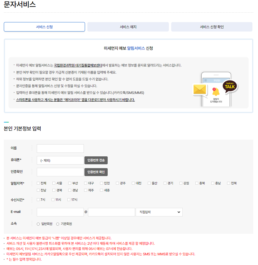 ※ 미세먼지 문자알림 서비스는 미세먼지 예보 등급이 "나쁨" 이상일 경우에만 서비스가 제공된다.