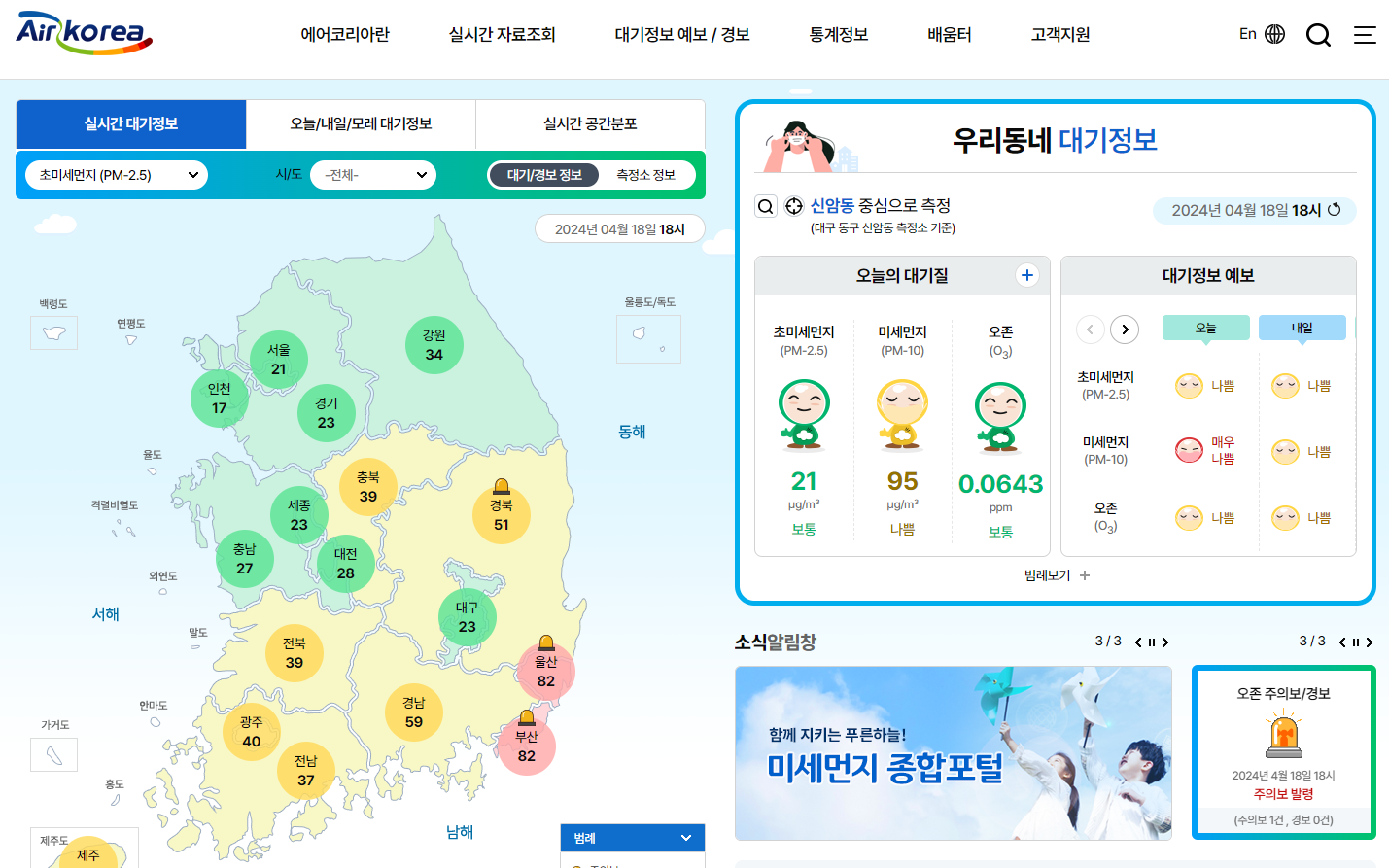 한국환경공단에서 실시간 대기정보를 확인할 수 있는 대기환경정보실시간공개시스템을 운영하는 사이트이다.