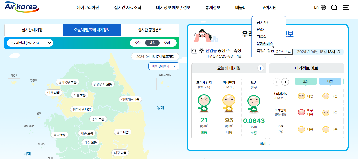 에어코리아에서는 실시간 미세먼지 농도 확인, 미세먼지 예보 확인, 미세먼지 예보 문자알림 서비스 등을 제공하는 사이트이다.