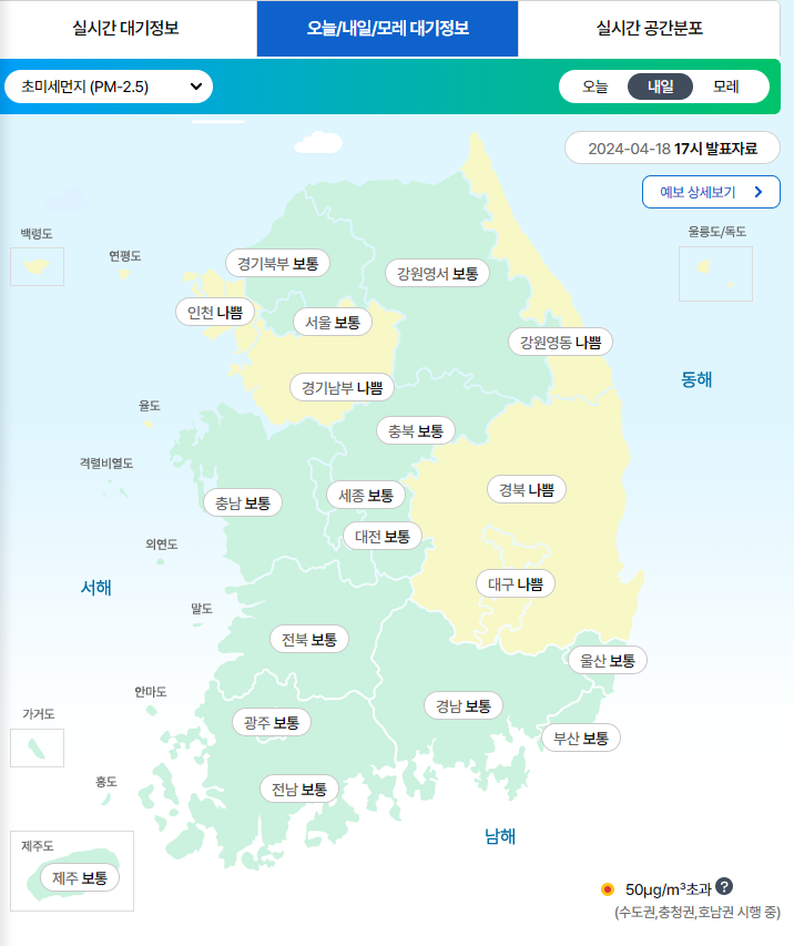 오늘/내일/모레 대기정보에서는 각 도시별 통합대기환경지수, 초미세먼지, 미세먼지, 오존, 이산화질소, 일산화탄소, 아황산가스 농도를 예측 확인할 수 있다.