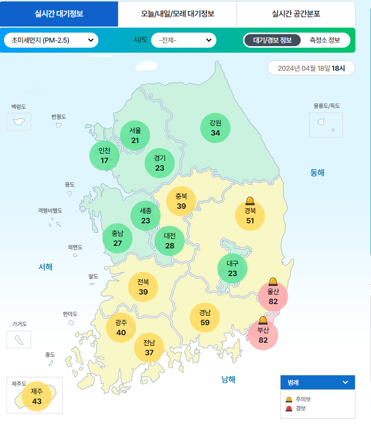 실시간 대기정보에서는 각 도시별 통합대기환경지수, 초미세먼지, 미세먼지, 오존, 이산화질소, 일산화탄소, 아황산가스 농도를 확인할 수 있다.