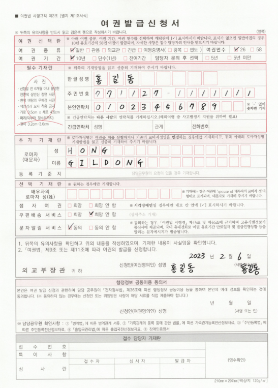 1. 여권발급신청서(여권 발급 기관에 비치되어있음)