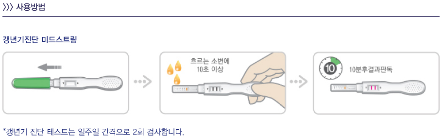 여성 갱년기를 자가진단 해볼 수 있는 테스트기가 있는데 혈액검사가 아닌 소변을 이용해서 간단한 테스트를 해볼 수 있다.