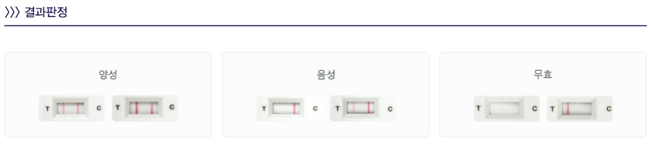 그 외 결과선(T)가 나타나지 않거나, 대조선(C)보다 흐리게 나타날 경우 음성이며, 결과선(T)와 대조선(C) 모두에 선이 나타나지 않거나, 결과선에만 선이 나타날 경우에는 무효로 판정한다.