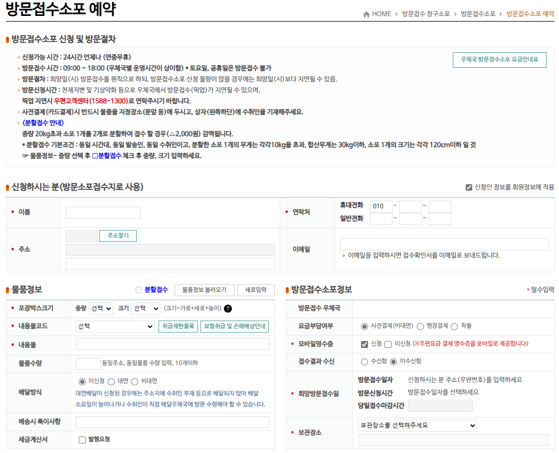 2. 신청하는 사람의 이름, 연락처, 주소를 입력하고 물품정보와 방문접수소포정보를 입력한다.