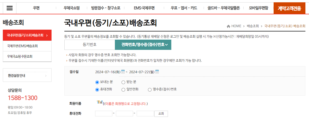 3. 전화번호/영수증(접수)번호를 클릭하고 접수일 설정한 후, 휴대전화, 일반전화, 영수증(접수)번호 중 하나라도 아는 것을 클릭하여 입력해준다.