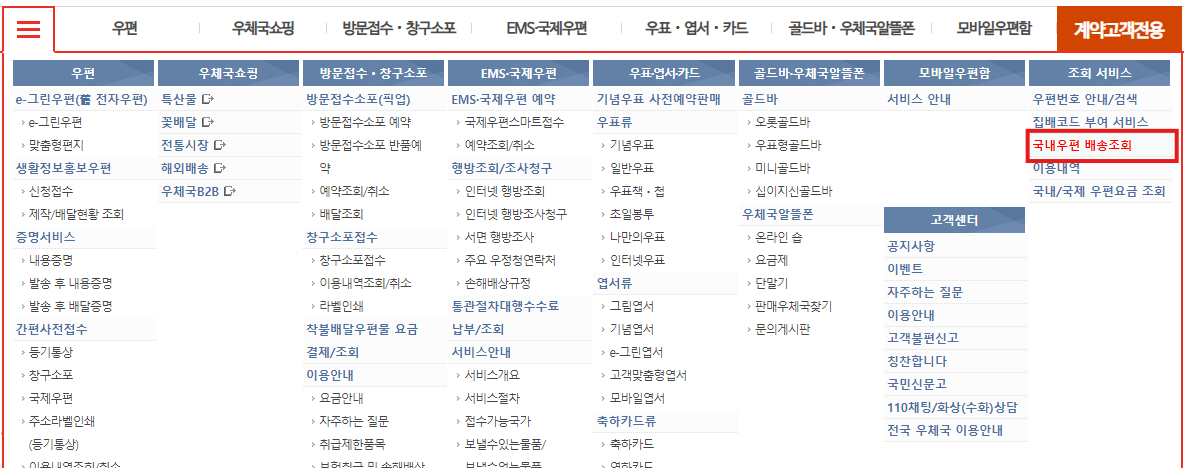 2. 전체메뉴 - 조회서비스 - 국내우편 배송조회를 클릭한다.