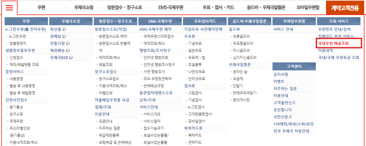 2. 전체메뉴 - 조회서비스 - 국내우편 배송조회를 클릭한다.