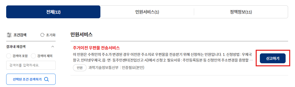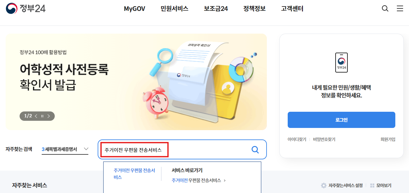 ② 검색창에 주거이전 우편물 전송서비스를 입력하여 검색한다.