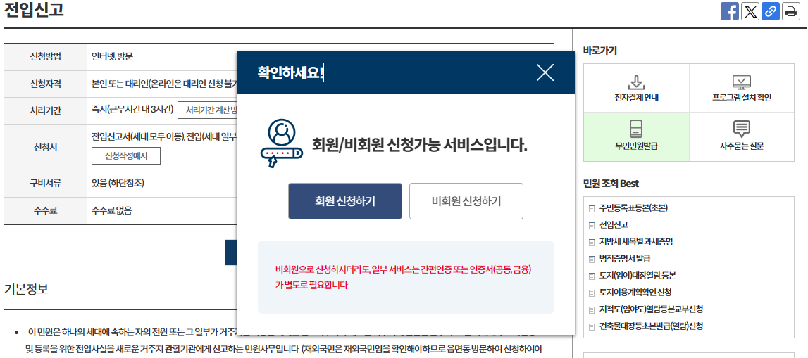 회원 신청하기 버튼을 눌러 간편인증 또는 공동·금융 인증서로 인증해준다. 비회원으로 신청도 가능하나 일부 서비스는 간편인증 또는 인증서가 별도로 필요로 하므로 번거롭지 않게 회원 신청하기 버튼을 눌러준다.