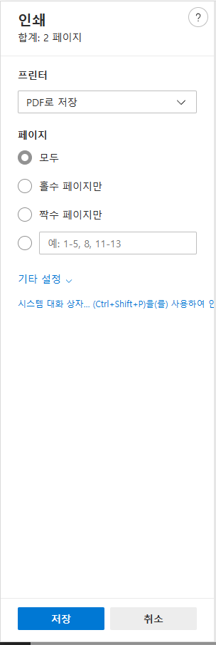 2. 누르면 다음과 같은 화면이 나타나는데 프린터 - PDF로 저장을 클릭한 후 저장 버튼을 눌러준다.