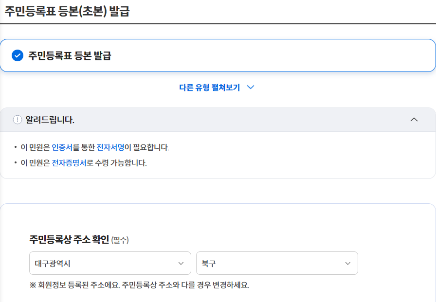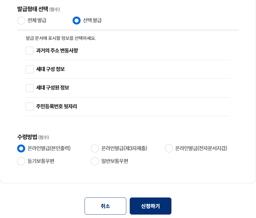 4. 주민등록상주소를 입력해준다. 기본 발급과 선택 발급 중에 선택하면 되는데 선택 발급은 주민등록등본에 표시할 정보를 직접 선택하는 방식이다.