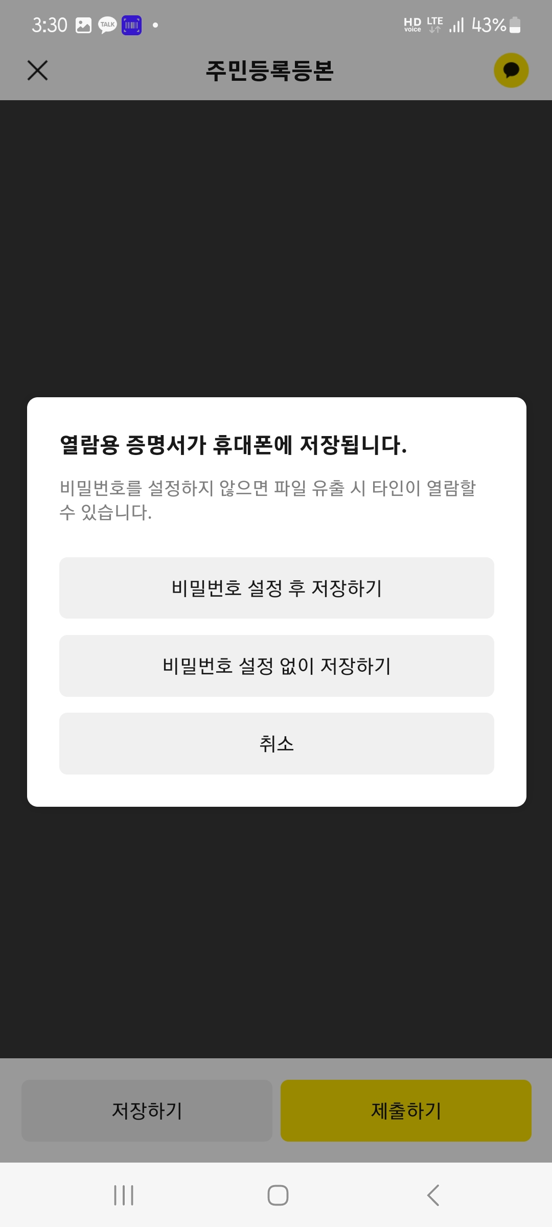 6. 저장하기 버튼을 누른다. 비밀번호 설정 후 저장하기와 비밀번호 설정 없이 저장하기가 있는데 우리의 정보는 소중하니 비밀번호 설정 후 저장하기를 권장한다. PDF 파일로 핸드폰에 저장된다.