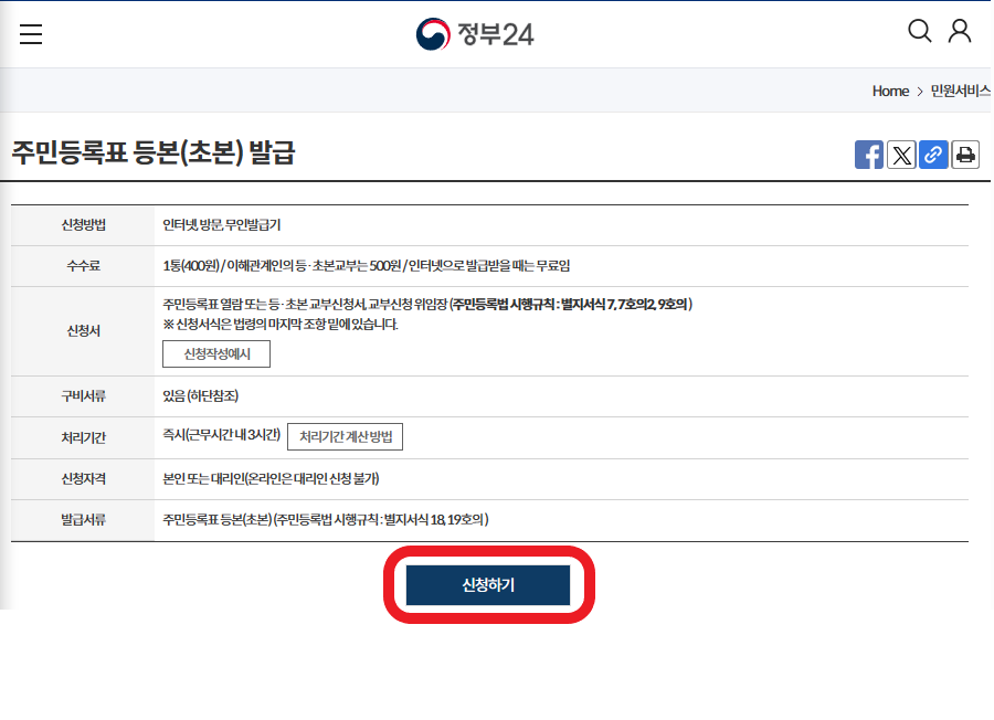 2. 주민등록표 등본(초본) 발급 신청하기를 누른다.