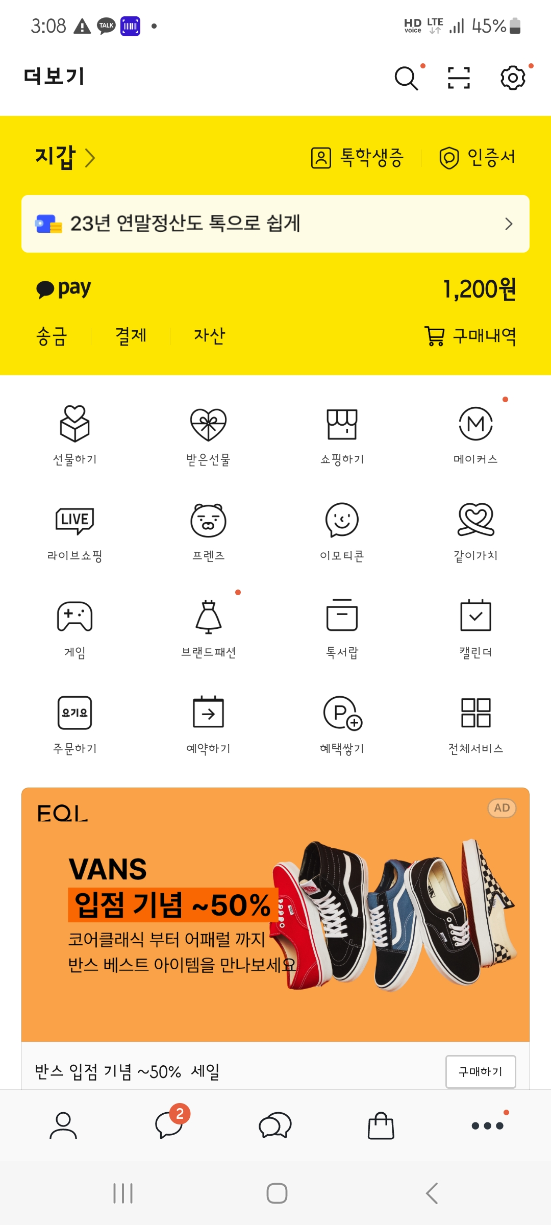 1. 카카오톡 우측 하단에 ... 를 클릭하면 더보기 화면이 나타난다. 지갑을 클릭한다.