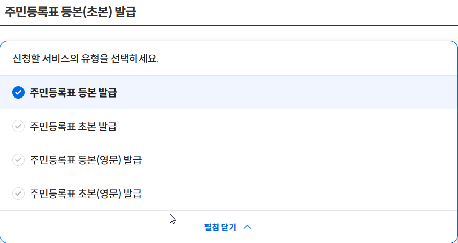 5. 인증을 완료하였다면 주민등록표 등본(초본) 발급 화면이 나올 것이다. 원하는 서비스의 발급 유형을 선택해준다.