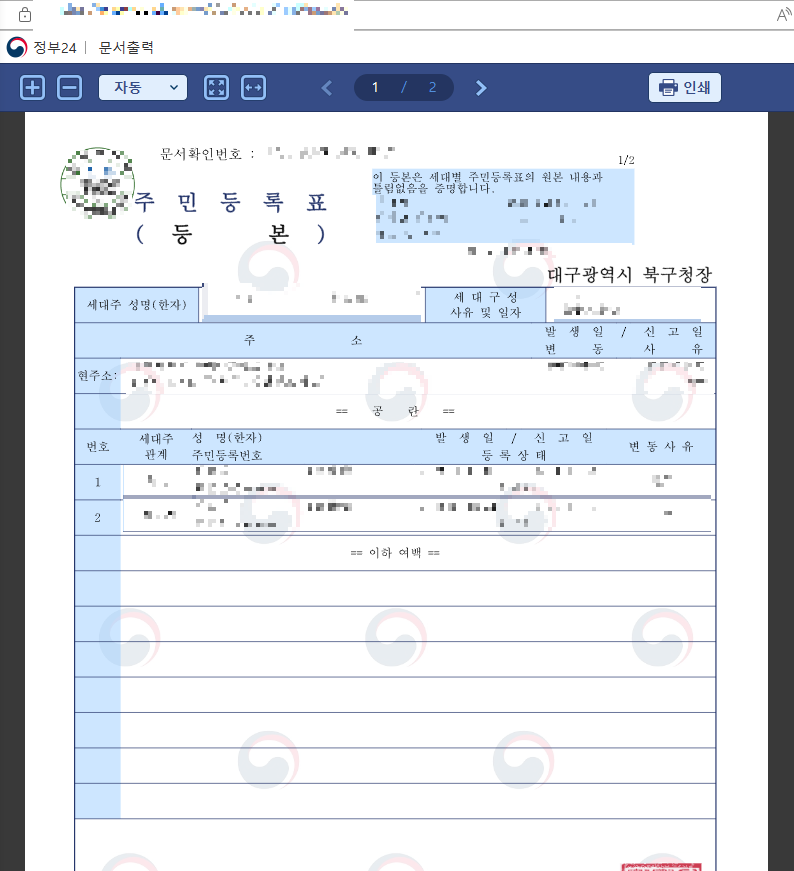 1. 주민등록등본 인터넷 발급 방법에서 처리가 완료되었다면 문서출력버튼을 눌러준다. 문서출력버튼을 누르면 다음과 같은 화면이 나타나고 오른쪽 상단에 인쇄 버튼을 눌러준다.