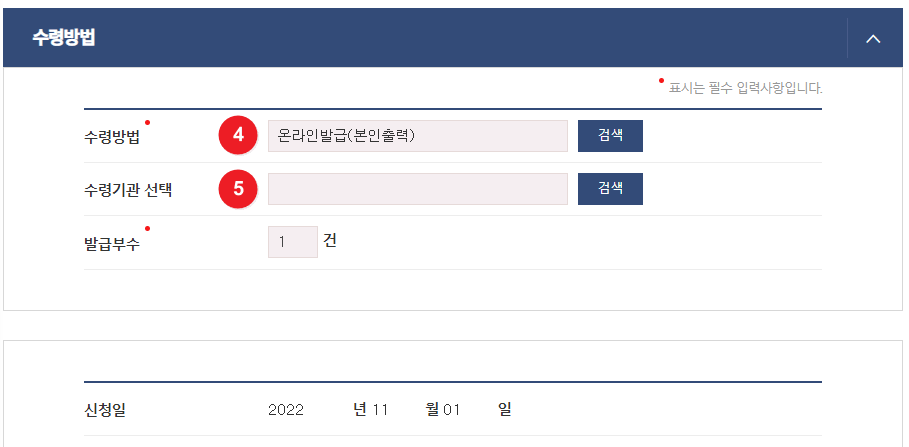 6. ④수령방법 검색버튼을 클릭하여 어떤 방식으로 수령 받을 것인지 선택한다. ⑤수령방법이 방문수령인 경우, 수령기관 검색버튼을 클릭하여 선택해준다.