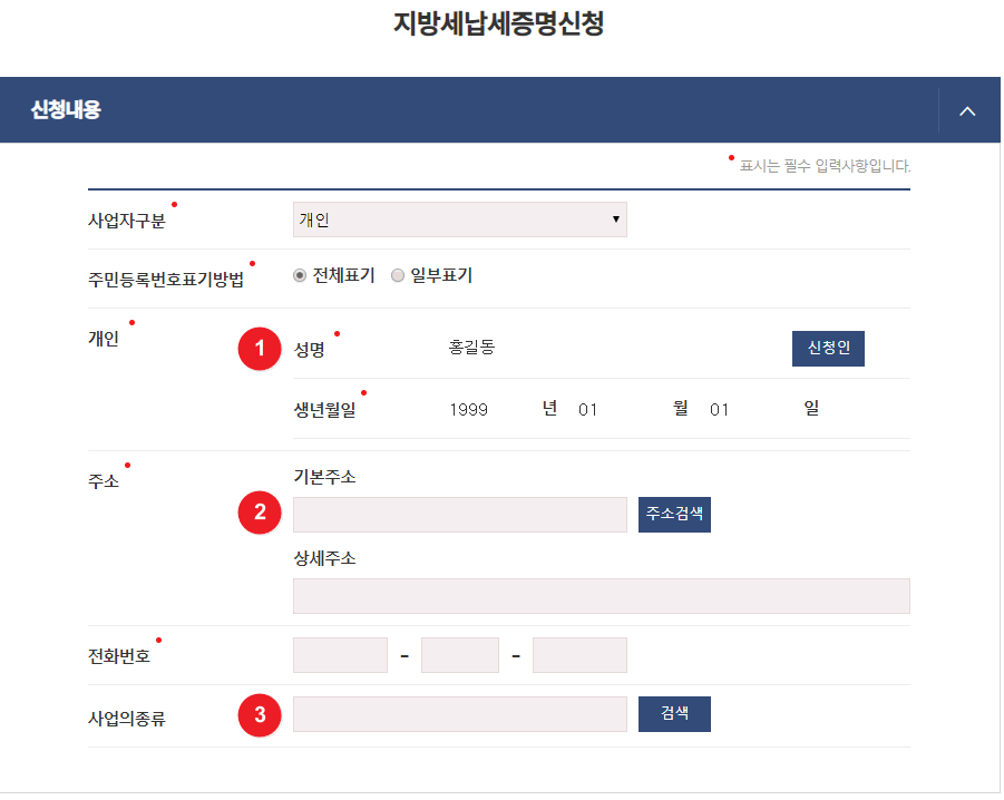 4. 사업자구분을 선택하고 ①신청인 버튼을 클릭하여 신청인의 기본정보를 자동으로 입력한다. ②주소검색 버튼을 클릭하여 주소검색창에서 주소를 선택하고, 전화번호를 입력한 후 ③검색버튼을 클릭하여 사업의 종류를 자동으로 입력한다.